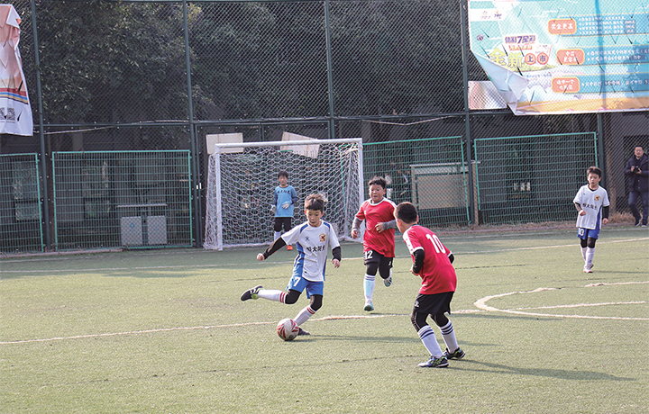11月22日,足球小將在賽場上奮力拼搏。