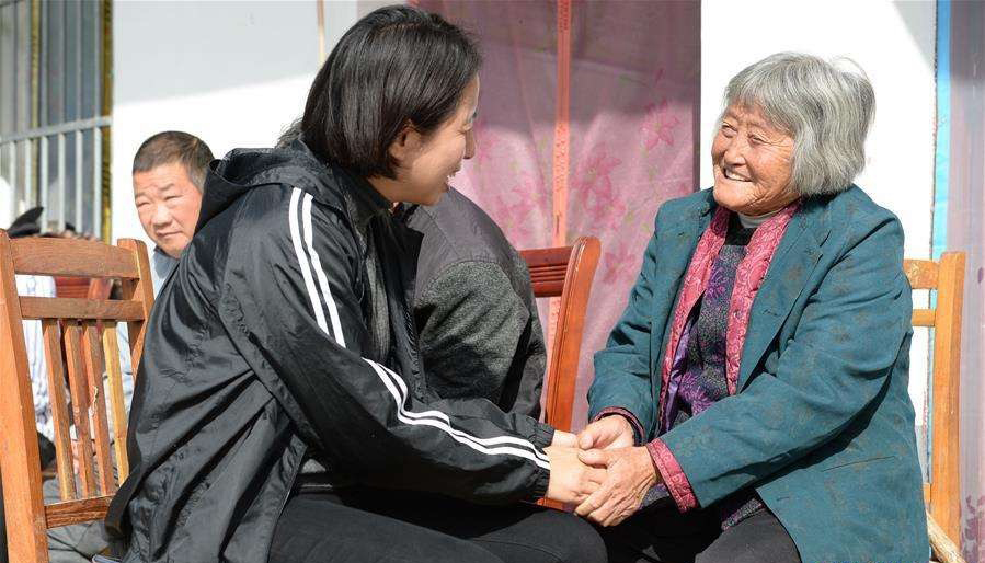 △劉雙燕在安徽省亳州市利辛縣的養(yǎng)老院內(nèi)和老人交流。