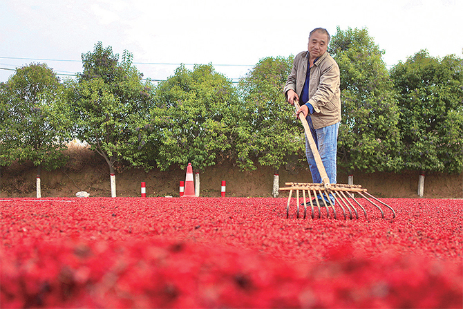 初冬時(shí)節(jié),坡頭鎮(zhèn)的山茱萸喜獲豐收。村民忙著晾曬山茱萸,臉上洋溢著豐收的喜悅。記者 劉培琳 攝