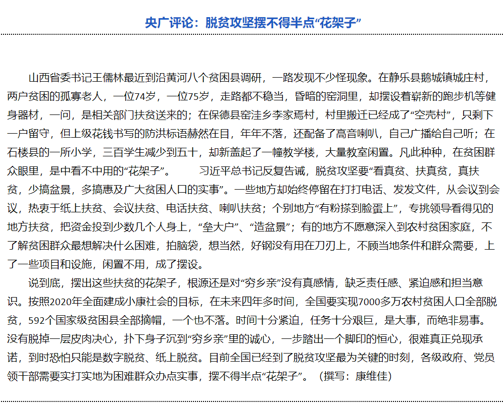 國家廣電總臺山西記者站康維佳在脫貧的路上寫了幾十篇相關報道。他的述評《脫貧攻堅擺不得半點花架子》獲第二十七屆中國新聞二等獎。