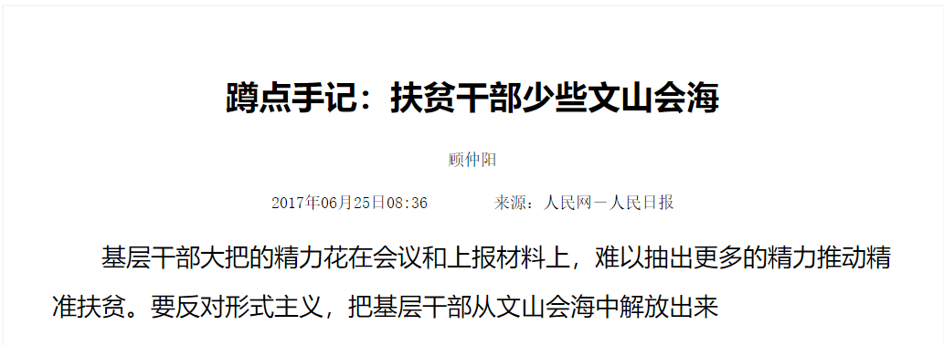 據作者顧仲陽介紹,其中,《扶貧干部少些文山會?!芬晃?,1100字既有基層干部一年開280多場會、同一主題會開四遍的鮮活事例,又有基層干部忙于開會填表,誰來打通政策“最后一公里”的思考。文章見報幾個小時,在人民日報客戶端的閱讀量就超過100萬人次,跟進的評論2000多條,多家媒體和平臺轉載。