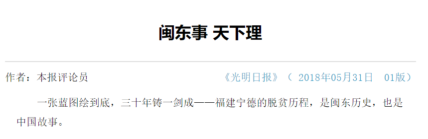 2018年5月31日,光明日報一版辟專欄刊發(fā)的《滴水穿石三十年——福建寧德脫貧紀事》和評論員文章《閩東事 天下理》。