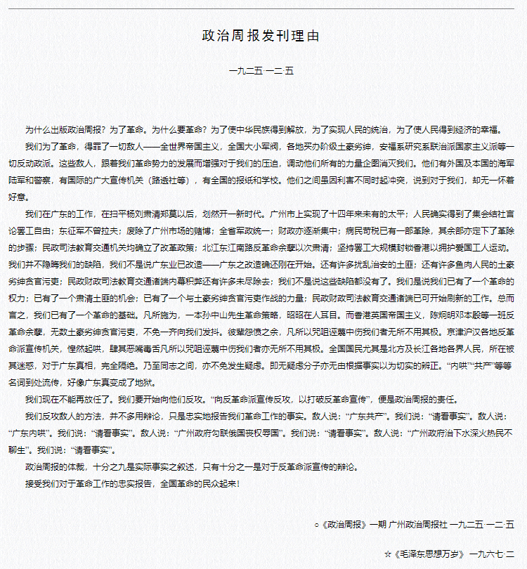 毛澤東同志是文章大家,他在《〈政治周報〉發(fā)刊理由》中鮮明地指出:“我們反攻敵人的方法,并不多用辯論,只是忠實地報告我們革命工作的事實?!?/p>