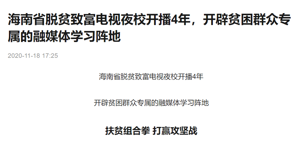 電視夜校創(chuàng)辦于2016年11月,是海南省委省政府打贏脫貧攻堅戰(zhàn)的一個創(chuàng)新舉措。他們首次開創(chuàng)“電視+夜校+釘釘+熱線”的全新模式,致力于通過電視課堂的形式向基層干部群眾講政策、傳技術、說感恩、樹典型、找工作、結姻緣,是一個專門為貧困群眾打造的融媒體學習陣地。