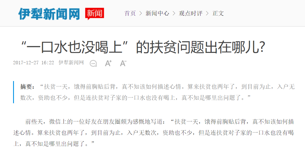 本次征稿刊登的唯一也是最后一篇來稿是來自新疆伊犁日報記者劉冰對自己經歷一年多的時間才完成一篇網絡評論《“一口水也沒有喝上”的扶貧問題出在哪兒?》(獲第二十八屆中國新聞獎三等獎)的思考。