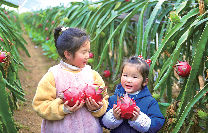 11月29日,小朋友在軹城鎮(zhèn)綺里村的大棚里展示剛剛采摘的火龍果。
