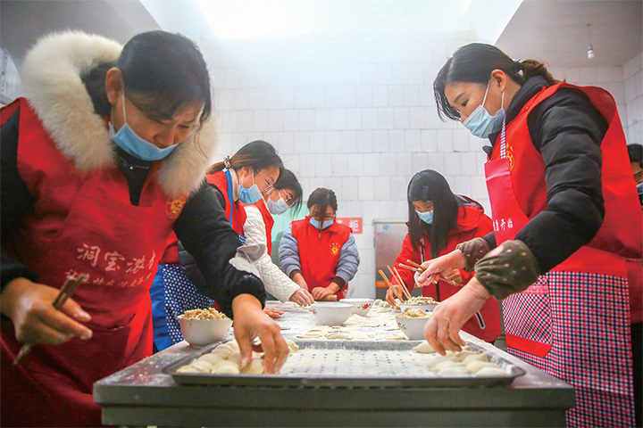 捐贈(zèng)活動(dòng)結(jié)束后,志愿者奔赴學(xué)校食堂,為孩子們準(zhǔn)備午飯。和面、搟皮、包餃子,大伙兒分工明確、有序進(jìn)行,只為孩子們能吃到熱騰騰的愛心餃子。