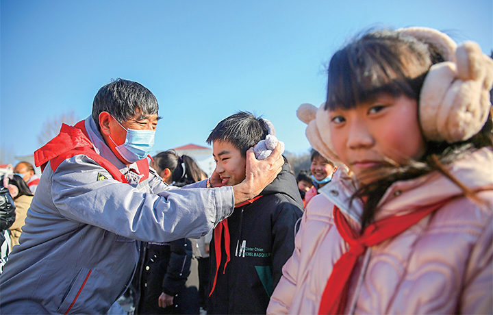 二年級的文文右臉上長了個(gè)凍瘡,志愿者為她戴上耳暖時(shí),她笑得格外開心。文文悄悄告訴記者:“耳暖好暖和啊。有了耳暖之后,我的凍瘡應(yīng)該就會(huì)好了?!?/p>