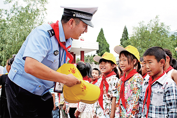 薛龍寶為山區(qū)小學(xué)生發(fā)放小黃帽
