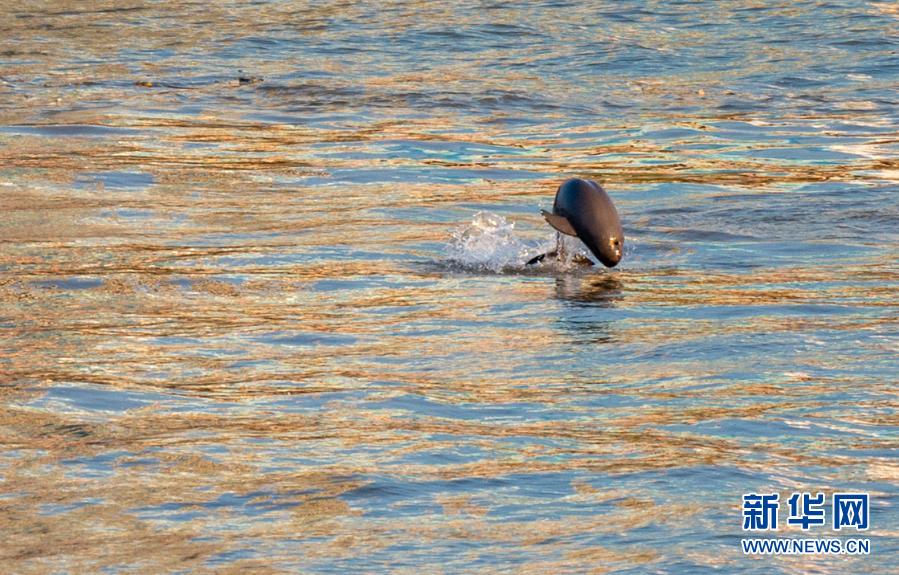 江豚在湖北省宜昌市西陵區(qū)鎮(zhèn)江閣外沿長(zhǎng)江水域逐浪嬉戲(2020年8月3日攝)。新華社發(fā)(雷勇 攝)