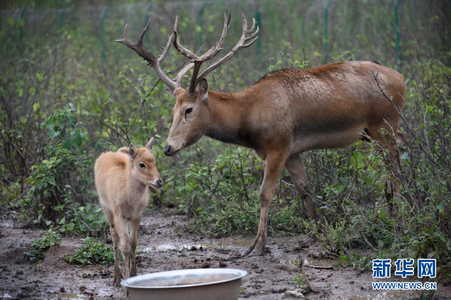 這是在湖南洞庭湖麋鹿和鳥(niǎo)類救護(hù)避難所拍攝的被救助的麋鹿“犇犇”(右)和一只小麋鹿(2018年5月23日攝)。新華社記者 李尕 攝