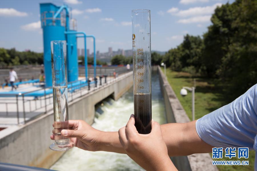一名工作人員在重慶市南岸區(qū)雞冠石污水處理廠出水口比較污水和出水的不同水質(zhì)(2018年7月28日攝)。重慶市南岸區(qū)雞冠石污水處理廠位于長(zhǎng)江南岸,在保護(hù)長(zhǎng)江環(huán)境中扮演著重要角色。新華社記者 金立旺 攝