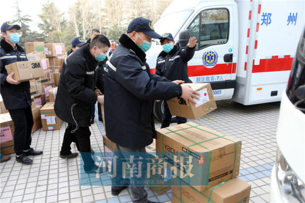 河南商報(bào)記者在現(xiàn)場看到,車隊(duì)的一號(hào)車為物資保障車,它是一輛荷載22人的大客車,車箱內(nèi)的乘客座位和過道上塞滿各種成箱的醫(yī)療物資,其中以連體式醫(yī)用防護(hù)服和口罩居多。