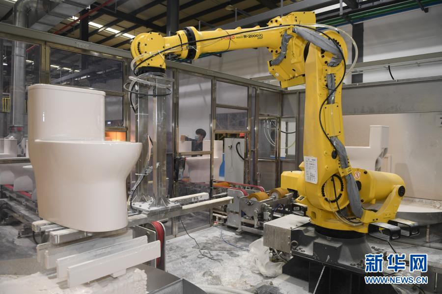 在福建省泉州市永春縣,智能機器人在福建省首家5G智慧陶瓷工廠——九牧永春智慧制造產(chǎn)業(yè)園區(qū)101#智慧工廠生產(chǎn)潔具(2021年1月13日攝)。新華社記者 宋為偉 攝