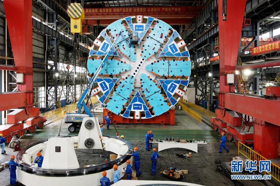 在隧道股份上海隧道工程有限公司機械制造分公司生產(chǎn)車間,工人對“騏躍”盾構機進行安裝調試(2020年10月15日攝,無人機照片)。新華社記者 方喆 攝
