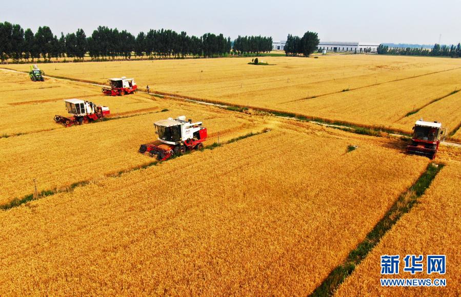 聯(lián)合收割機在河北省泊頭市西辛店鄉(xiāng)大付村的麥田里作業(yè)(2020年6月12日攝,無人機照片)。新華社記者 牟宇 攝
