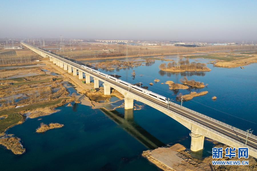 運行試驗動車組列車通過徐連高鐵沂河特大橋(2021年1月8日攝,無人機照片)。徐連高鐵位于江蘇省北部黃淮平原地區(qū),西起徐州市,東至連云港市,正線全長約180公里。新華社記者 季春鵬 攝