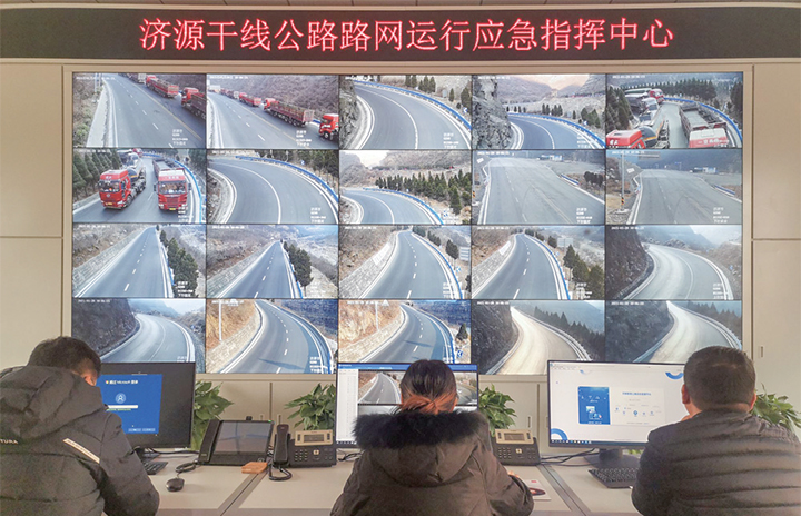 1月20日,在濟(jì)源干線公路路網(wǎng)運(yùn)行應(yīng)急指揮中心,工作人員正在通過顯示屏查看路況。