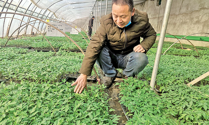 1月22日,農(nóng)民在梨林鎮(zhèn)北瑞村的一個(gè)蔬菜育苗基地里查看西紅柿種苗培育情況。