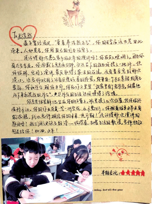 1月25日,在邵原一中校園里,記者翻看史偉娜寫(xiě)給全班學(xué)生的信發(fā)現(xiàn),從信封到信紙,再到精美圖章,以及為本學(xué)期表現(xiàn)評(píng)級(jí)的手畫(huà)小星星,處處可見(jiàn)用心程度。
