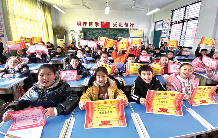 1月29日,在黃河路小學(xué),學(xué)生正在展示領(lǐng)到的獎狀。