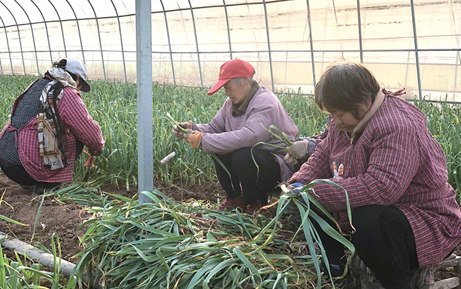 同樣心滿意足的還有南官莊村脫貧戶牛小頭?!爸灰獔@區(qū)里有活我就過來。這里離家近,我來去都方便。原來我沒活干,沒啥收入,現(xiàn)在每月有1500元左右的收入?!迸P☆^原是村里的建檔立卡貧困戶,常年孤身一人。鎮(zhèn)村兩級持續(xù)對他進(jìn)行精準(zhǔn)幫扶,將他吸納到園區(qū)務(wù)工,幫助他穩(wěn)定脫貧。如今早已脫貧的牛小頭,對生活充滿了希望。無論分派什么工作,他都會認(rèn)真完成。眼下正是21棚蒜苗的采收高峰期,牛小頭每天都在園區(qū)里忙活?!霸诩议T口就有活干有錢掙,這日子越過越有盼頭?!迸P☆^笑著說。