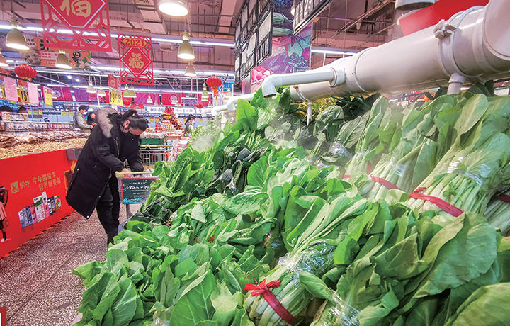 在丹尼斯沁園店內(nèi),記者看到,店員們正在忙碌地布置春節(jié)掛件。抬頭望去,大紅燈籠高高懸掛;再往前,精美的水果禮盒應(yīng)接不暇,“買一送一”的促銷活動(dòng)招牌隨處可見(jiàn)。