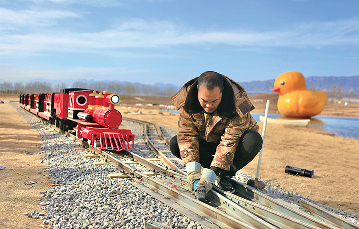 2月3日,牡丹園的工作人員正在安裝調試花海列車。