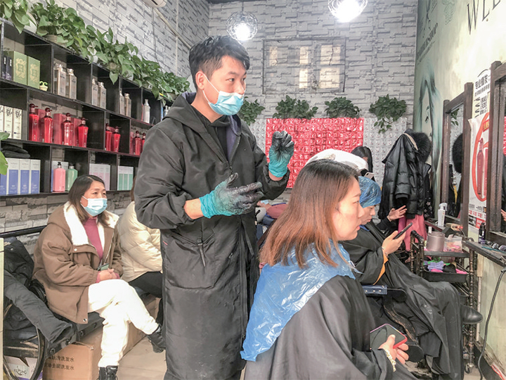 2月6日晚11點,位于軹城大街的艾渡理發(fā)店依然燈火通明。來自武陟的發(fā)型師朱師傅已經給顧客的頭發(fā)抹完精油?!笆展ぃ 敝鞄煾迪崎_客人身上的理發(fā)圍布。這是他當天接待的最后一位顧客。