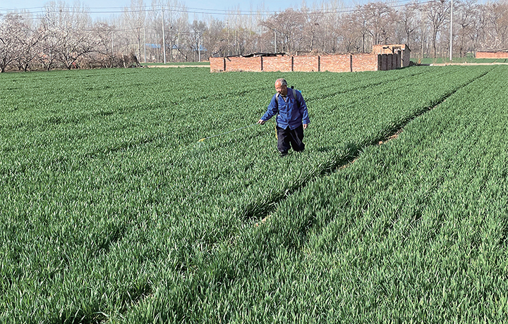 3月3日,在軹城鎮(zhèn)河岔村,農(nóng)民在噴灑除草劑。記者 趙新迪 攝