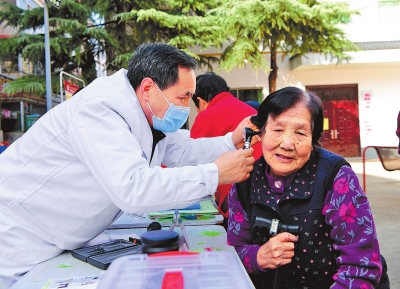 3月4日,靈寶市衛(wèi)健委組織黨員志愿者和醫(yī)護(hù)人員在金秋公寓為老年人義診。張星星 攝