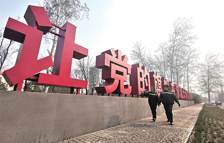 3月11日,兩名園林工人從濟(jì)源圖書館附近的黨建文化標(biāo)識(shí)牌旁走過,趕往下一個(gè)作業(yè)地。