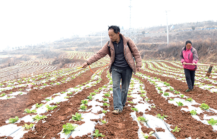 3月11日,河南省濟(jì)源市大峪鎮(zhèn)寺郎腰村農(nóng)民在田間為白菜種株打藥。