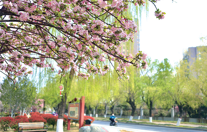 隨著氣溫回升,春意漸濃,湨河兩岸的海棠花競相綻放,將城市裝扮得更加美麗。記者 劉培琳 攝