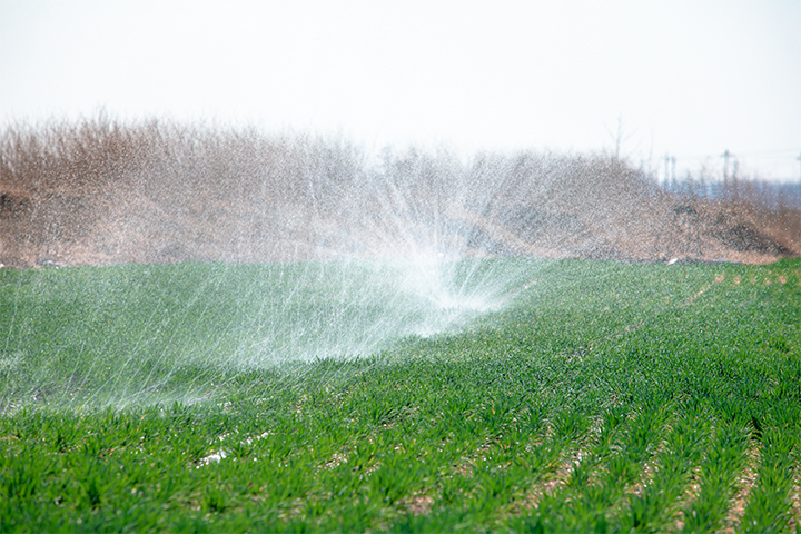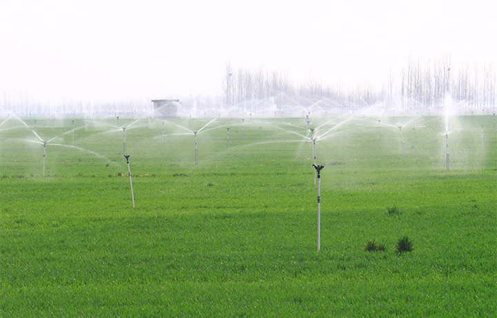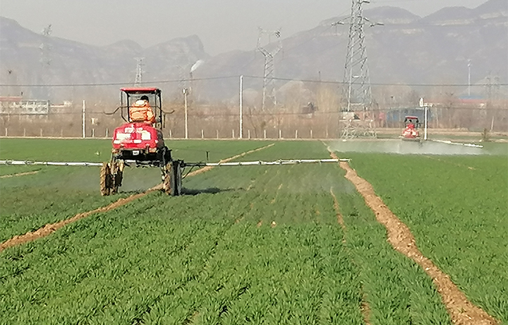 自走式噴霧機噴灑除草劑,成方連片的麥田里,一排排自動噴灌設(shè)施,噴射出一股股“雨霧”,均勻地噴灑在麥苗上,猶如天然“噴泉”,蔚為壯觀。