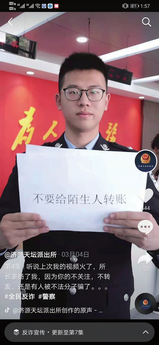 記者了解到,這條短視頻來自濟(jì)源天壇派出所,是由民警自導(dǎo)自演的。目前,這樣的反詐宣傳短視頻仍在持續(xù)更新,已經(jīng)到了第七集,瀏覽量共計109.9萬人次,賬號粉絲也有近2萬人。