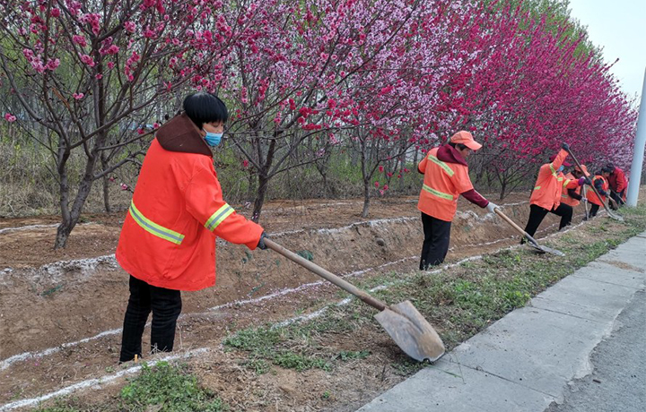 3月29日,在國道327西二環(huán)路兩旁的綠化帶內(nèi),身穿橘紅色工作服的養(yǎng)護工人正在清掃雜物、平邊坡、修路肩。