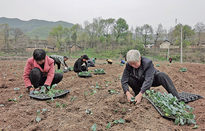 4月9日,在位于承留鎮(zhèn)山坪村的高山蔬菜基地里,周邊村民在移栽西藍花苗。