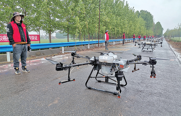 飛防人員準備就緒,即將進行植保無人機飛防演示。 記者 王莉 攝