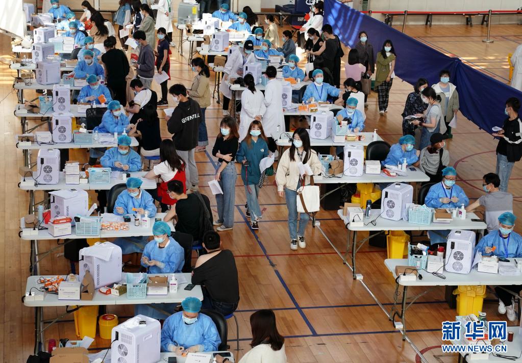 3月28日,在華東師范大學(xué)閔行校區(qū)體育館內(nèi),師生們?cè)诮臃N新冠疫苗。新華社記者 劉穎 攝
