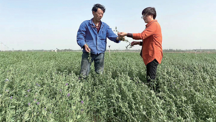 苜蓿每年可以收割四次,農(nóng)業(yè)技術(shù)人員正在給種植戶指導(dǎo)苜蓿后期管理。