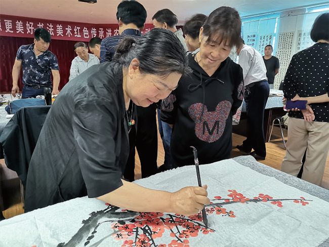活動現(xiàn)場,書畫家們揮毫潑墨,各顯身手。作品內(nèi)容豐富多彩,既有書法作品,也有梅花、牡丹、孺子牛等繪畫作品。一幅幅作品主題鮮明、意境深邃、氣勢恢宏,讓村民們大飽眼福,連連稱贊。