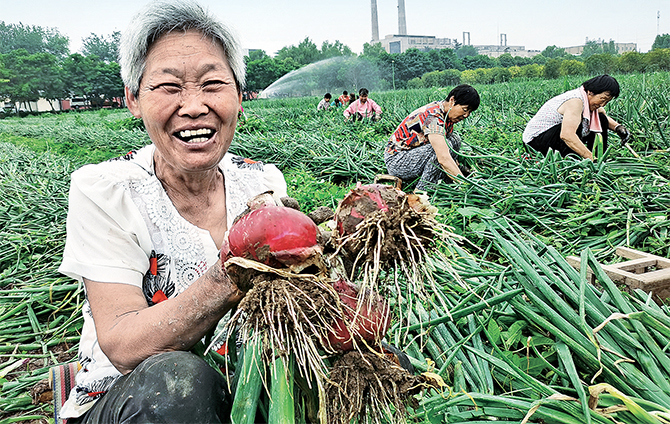 6月1日,在軹城鎮(zhèn)西軹城村的田間,20多位村民正在采挖洋蔥。