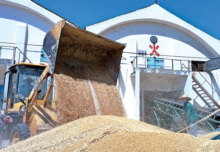 6月6日,濟(jì)源市南方糧業(yè)有限公司狄溝糧站收購(gòu)點(diǎn)正在收糧。記者 段二平 攝