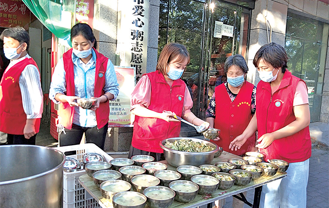 開飯后,志愿者們忙著打飯、加菜,并不時詢問飯菜是否可口、夠不夠。一句句暖心的問候,感動了前來就餐的所有人。一位老人激動地說:“他們真的太熱情了,讓我們體會到了家的溫暖,感受到了兒女的體貼?!?/p>