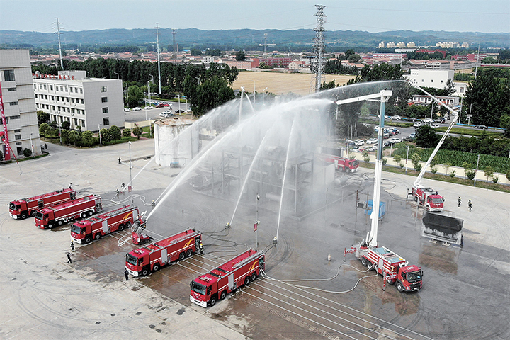 6月18日,在濟(jì)源市消防救援支隊(duì)實(shí)訓(xùn)基地,濟(jì)源市消防救援支隊(duì)正在進(jìn)行模擬化工裝置火災(zāi)應(yīng)急救援展演。各類(lèi)高噴炮、機(jī)器人和移動(dòng)炮齊集,8股強(qiáng)大的水柱騰空而起、橫貫長(zhǎng)空,向火魔發(fā)起了總攻,把應(yīng)急救援展演推向高潮。