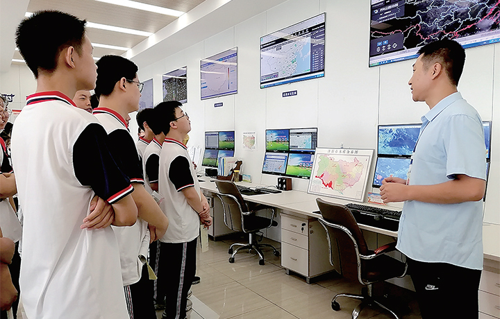 在氣象綜合業(yè)務平臺內(nèi),學生們了解了雷電、雷達、區(qū)域站、遙感雨量、空氣質(zhì)量等監(jiān)測平臺是如何工作的。當看到衛(wèi)星云圖監(jiān)測平臺時,學生們好奇地問:“它能監(jiān)測到宇宙飛船嗎?看著這些就能知道哪里會下雨、哪里會打雷嗎?”面對他們的提問,工作人員耐心解答,并告訴他們遇到雷電或暴雨天氣時該如何保護自己。