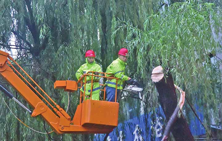 7月22日19時(shí),濟(jì)源市城投園林綠化有限公司防汛應(yīng)急搶險(xiǎn)隊(duì)工作人員正在對荊梁北街存在安全隱患的柳樹進(jìn)行截枝處理。劉靜宜 攝
