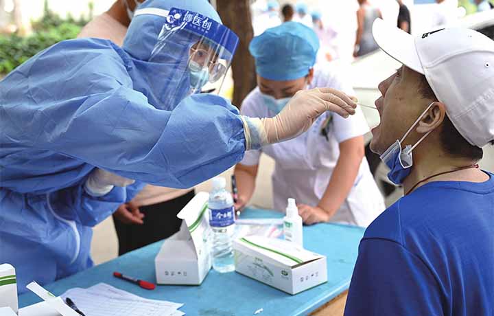 “阿姨,張大嘴巴,別緊張,一會(huì)兒就好了。”8月4日,在市二院核酸檢測(cè)采集現(xiàn)場(chǎng),身著“戰(zhàn)甲”的朱雅琳將一根長(zhǎng)棉簽伸進(jìn)被采集人員口中,擦拭其雙側(cè)咽扁桃體及咽后壁,然后麻利地將棉簽頂端折斷在采樣管里密封。這一系列動(dòng)作,朱雅琳一氣呵成。