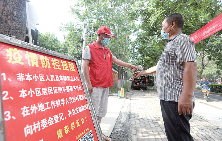 8月5日,軹城鎮(zhèn)王虎·祥和源小區(qū)防疫志愿者為進(jìn)入小區(qū)的居民測(cè)量體溫。記者 李楠 攝